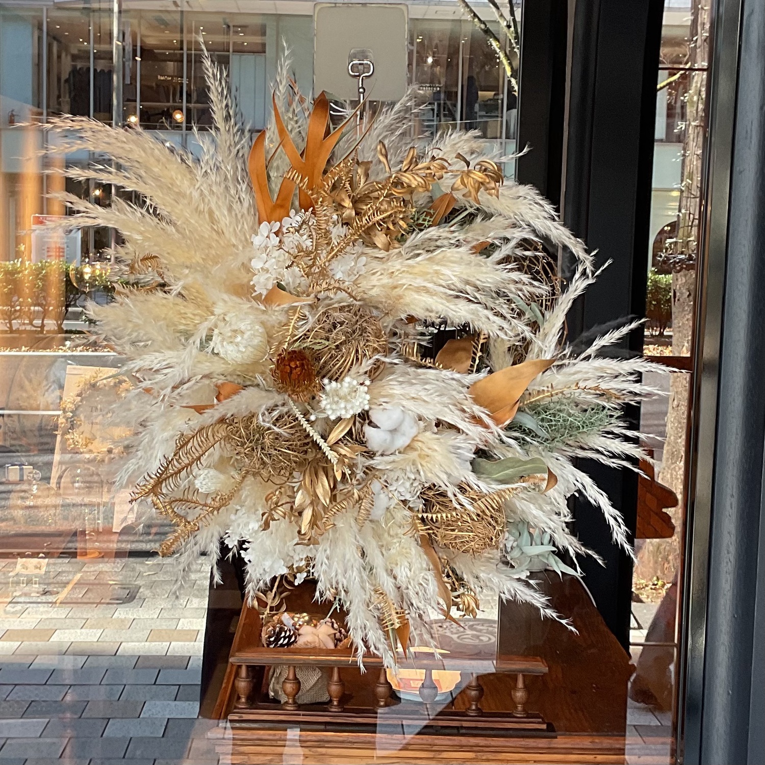 冬の気配をふんわりと感じさせる色合いのリースが飾られています。
