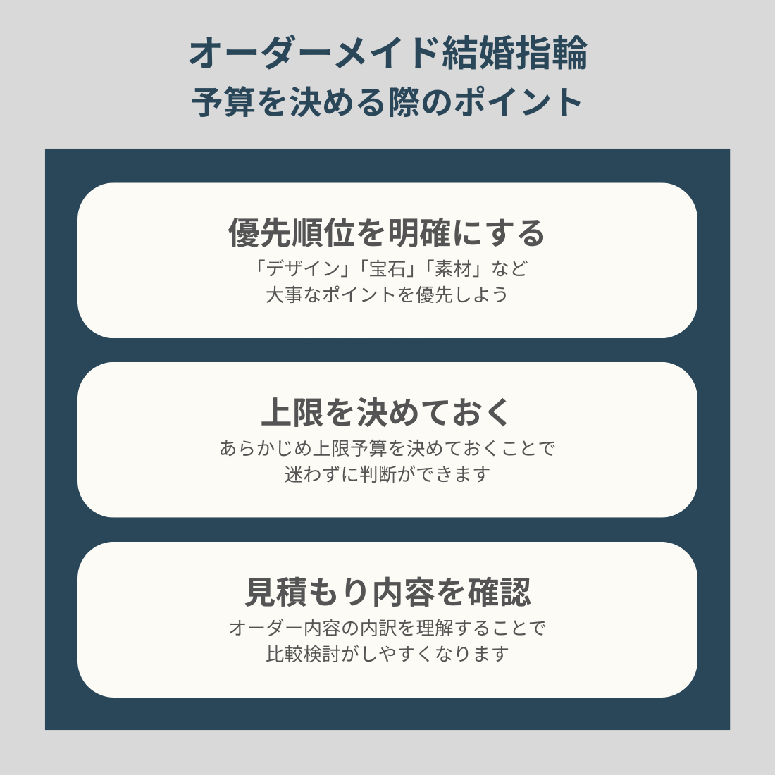 「素材」「デザイン」「宝石」など、譲れないポイントを整理することで、予算配分がしやすくなります。また、指輪の試着を通して、優先順位が変動することも考えらえます。その際は、改めて自分にとって、何が優先か見極めることで、安心でオーダーできます。