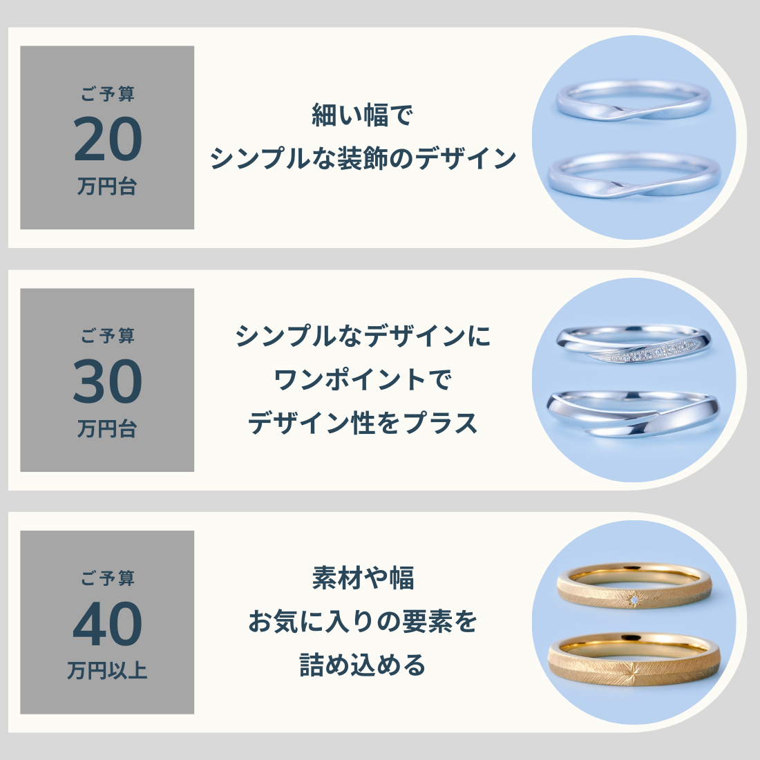 素材やデザインをシンプルにすることで、ペアで24万円前後からのオーダーメイドが可能です。